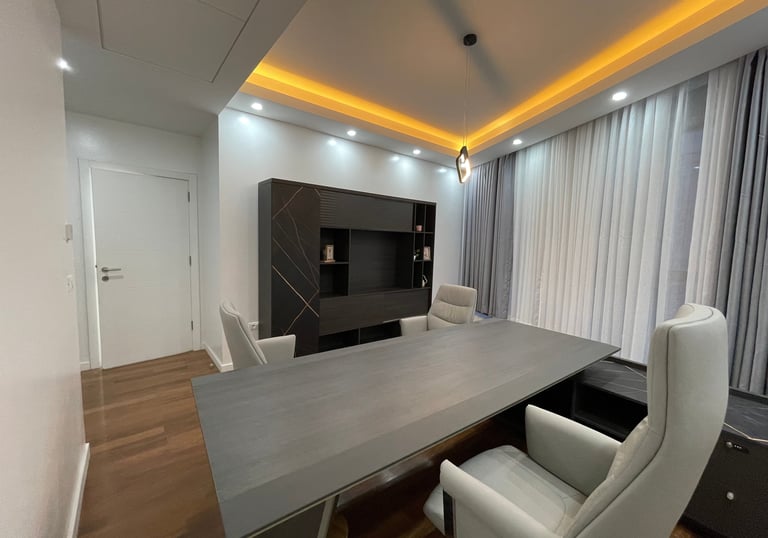Création d’un espace de travail élégant et structuré, favorisant la productivité dans une ambiance monochrome, raffinée et epurée.